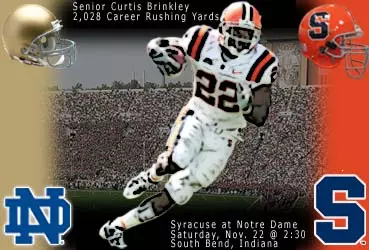The Orange looks to add to its rich tradition in one of college football’s most storied venues, Notre Dame Stadium, on Saturday, November 22. With only two games remaining in his Syracuse career, senior running back Curtis Brinkley is 63 career rushing yards behind SU legend Jim Brown on the school’s all-time record list.