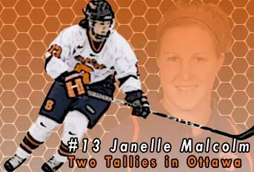 Freshman winger Janelle Malcolm (Edmonton, Alberta) responded to the familiar Canadian surroundings with two goals against Gee Gees' goalie Jessika Audet. Sophomore co-captain Stefanie Marty (Nussbaumen, Switzerland) punched in a goal for SU, as well.
