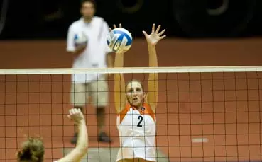 The team co-captain also set the tone offensively, posting 17 kills while hitting .382. Junior middle blocker Hayley Todd continued her success hitting from the outside, matching her career-high 13 kills, while senior outside hitter Kacie MacTavish and freshman middle blocker Samantha Hinz each added seven. Freshman setter Laura Homann powered the Orange offensive effort, dealing out 45 assists.